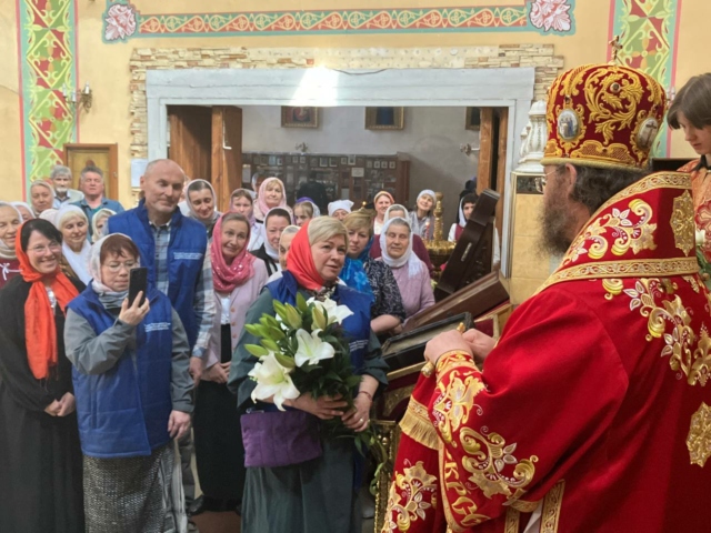 В подарок сотрудники центра помощи преподнесли владыке Никодиму букет белых лилий — как символ чистоты, веры и Пасхальной радости. После богослужения состоялась краткая беседа владыки с добровольцами Патриаршей миссии.